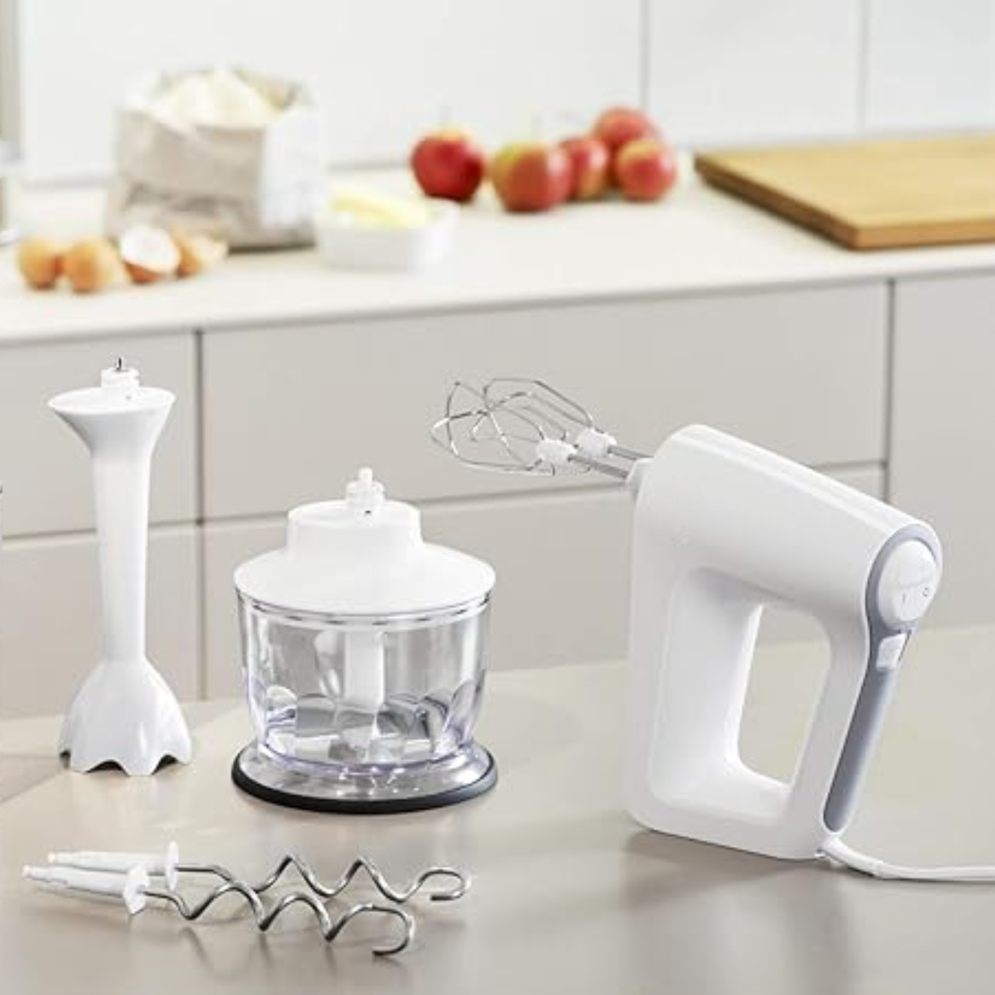 Inclus : fouet, pétrin, pied de mixeur, mini hachoir 500ml, bol gradué 600ml, socle mixeur